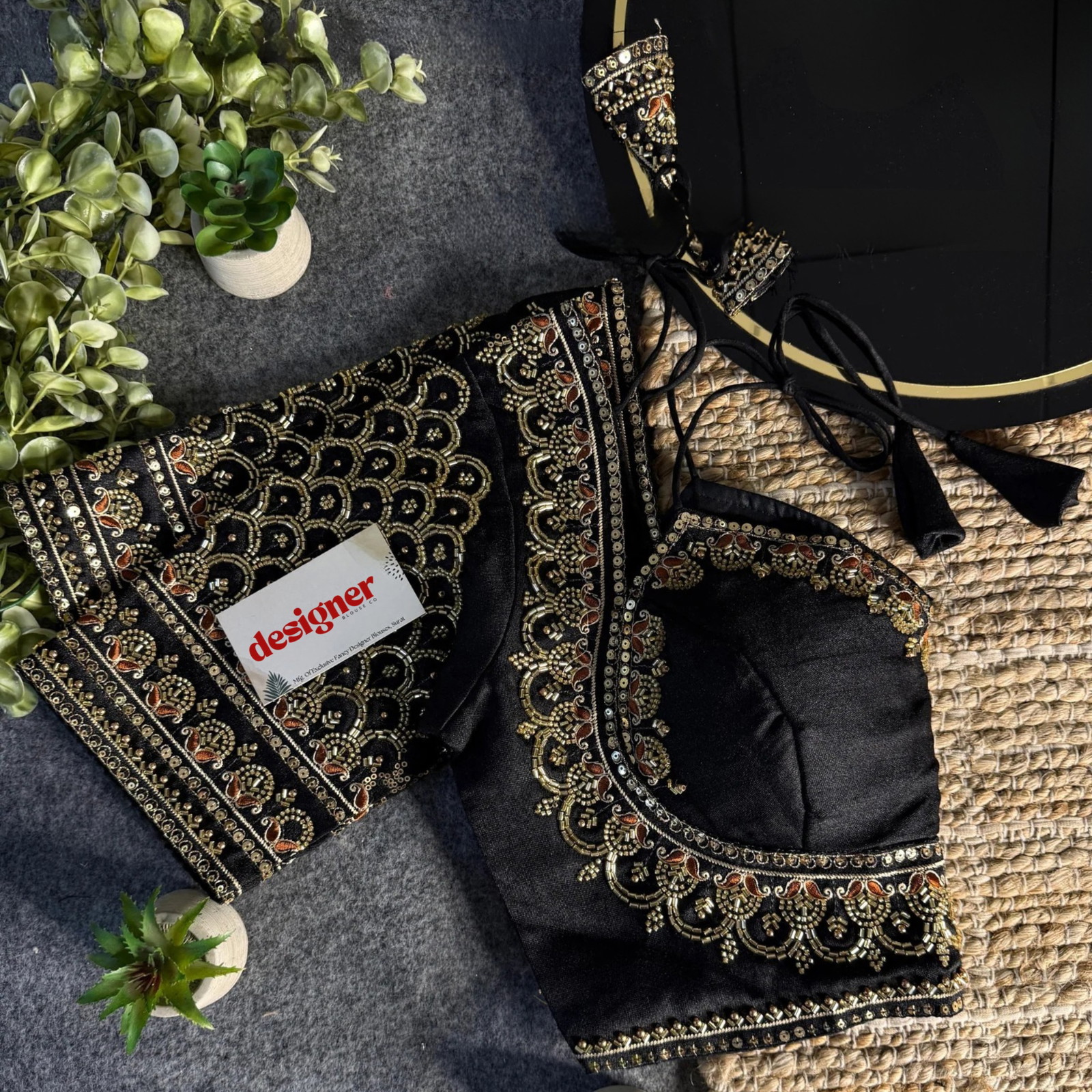 Elegant Italian Silk halter neck blouse with beautiful beads and rich embroidery work. Padded and back-open with hooks, this free-size designer blouse fits 34–42 bust and pairs perfectly with any saree or lehenga for weddings, receptions, and festive occasions.