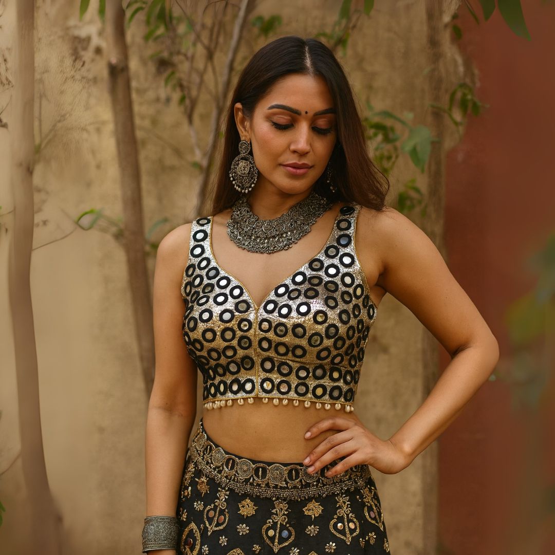 Shine bright in this Navratri readymade blouse, featuring vibrant multi-color circular mirror work and a classic dori-tie back. Crafted for festive flair, it’s adorned with shell lace for that authentic dandiya vibe. Perfect for Garba nights, this blouse pairs beautifully with lehengas, skirts, or sarees for an eye-catching traditional look.
