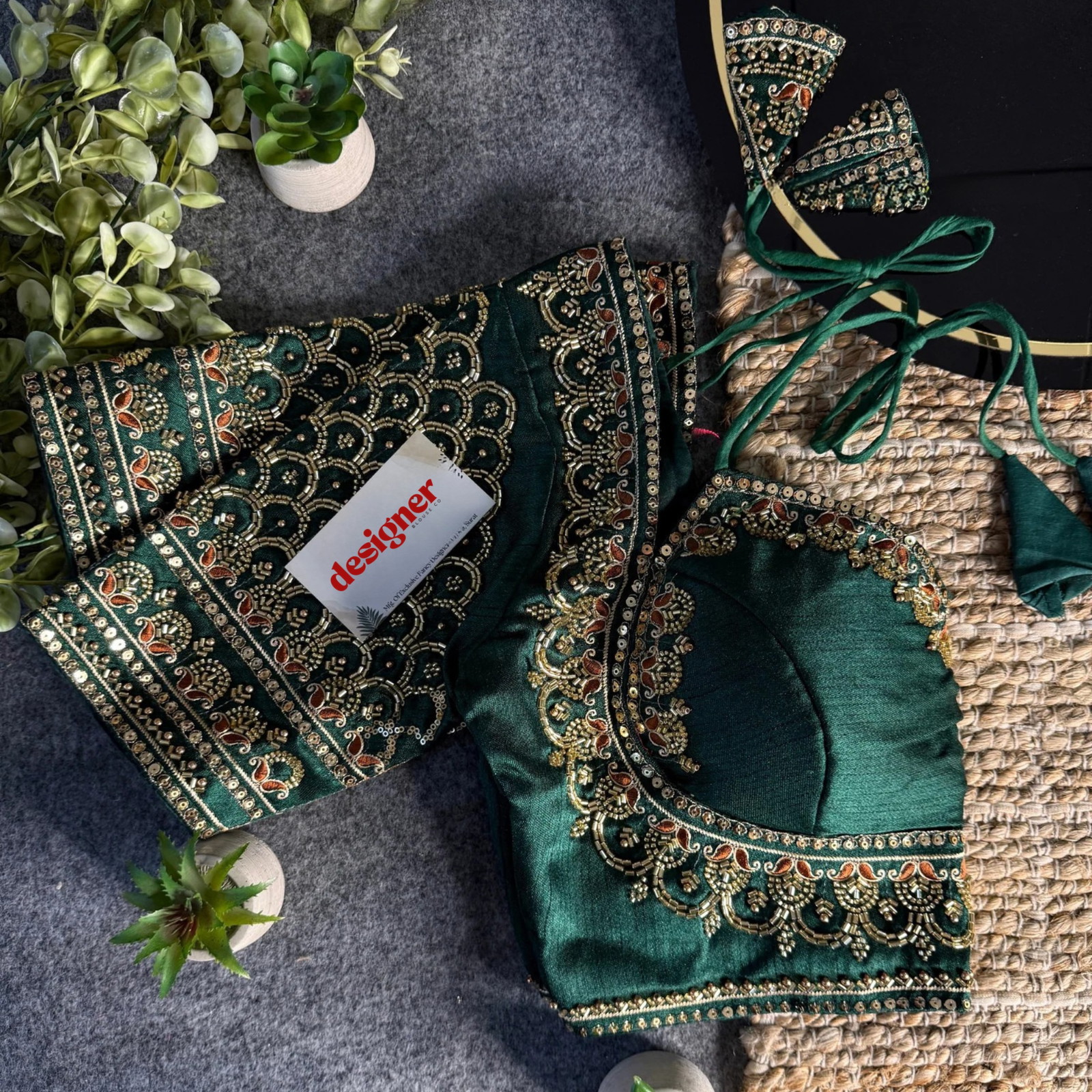 Elegant Italian Silk halter neck blouse with beautiful beads and rich embroidery work. Padded and back-open with hooks, this free-size designer blouse fits 34–42 bust and pairs perfectly with any saree or lehenga for weddings, receptions, and festive occasions.