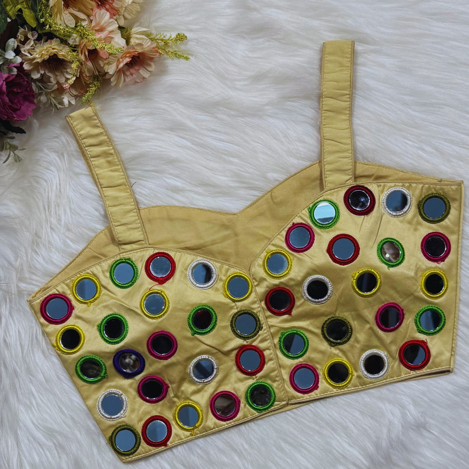 Celebrate this Navratri in style with our vibrant Silk mirror work blouse. Adorned with intricate Mirror work, it’s a perfect choice for garba nights and festive occasions. The soft cotton lining, perfect fit, and traditional charm make it a must-have partywear blouse for your ethnic wardrobe.