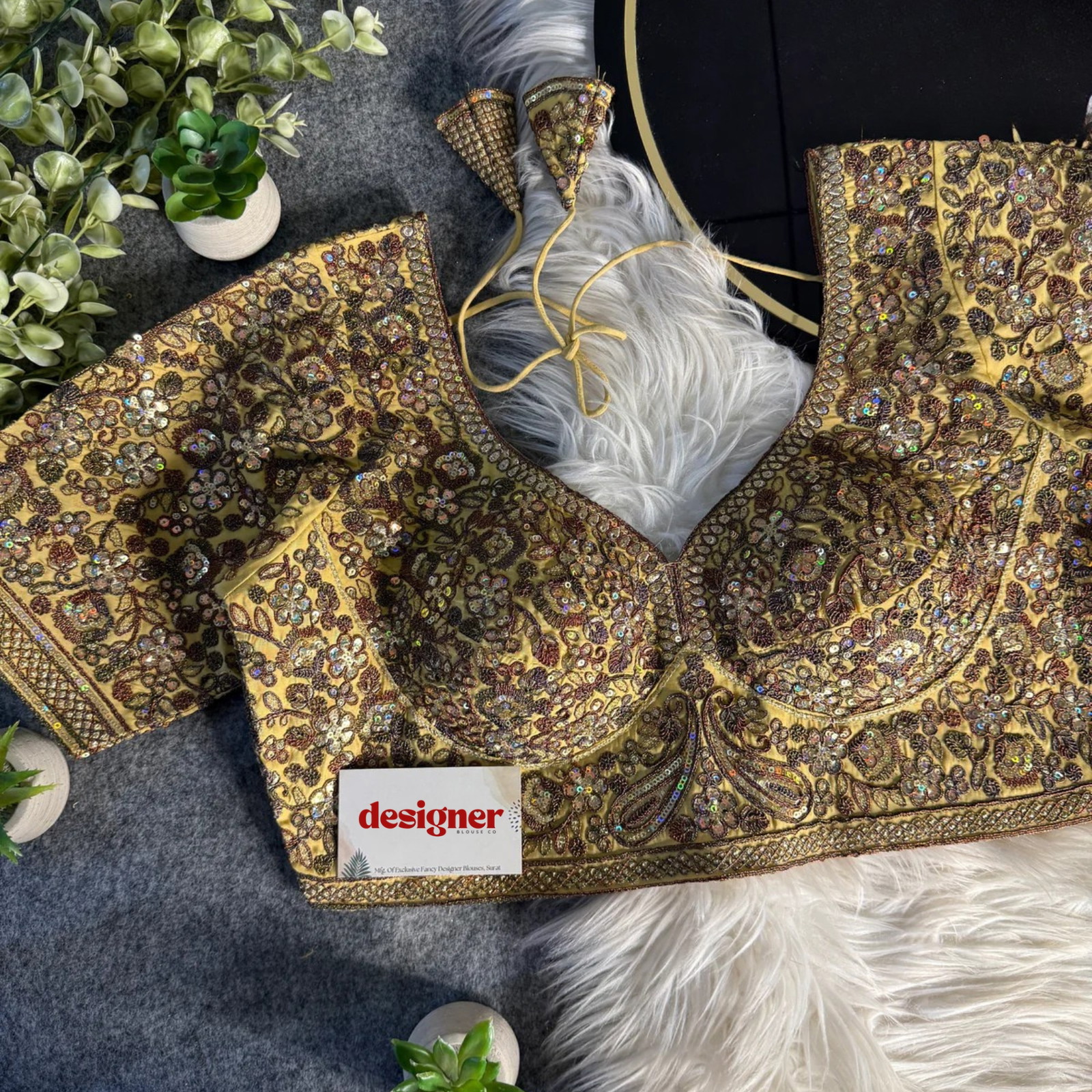 Italian Silk Heavy Coding & Sequence Work Sabyasachi Neck Designer Blouse, crafted in heavy Italian fabric with rich coding and shimmering sequin handwork. half-sleeve, padded, back open with hooks and pure cotton lining for comfort.