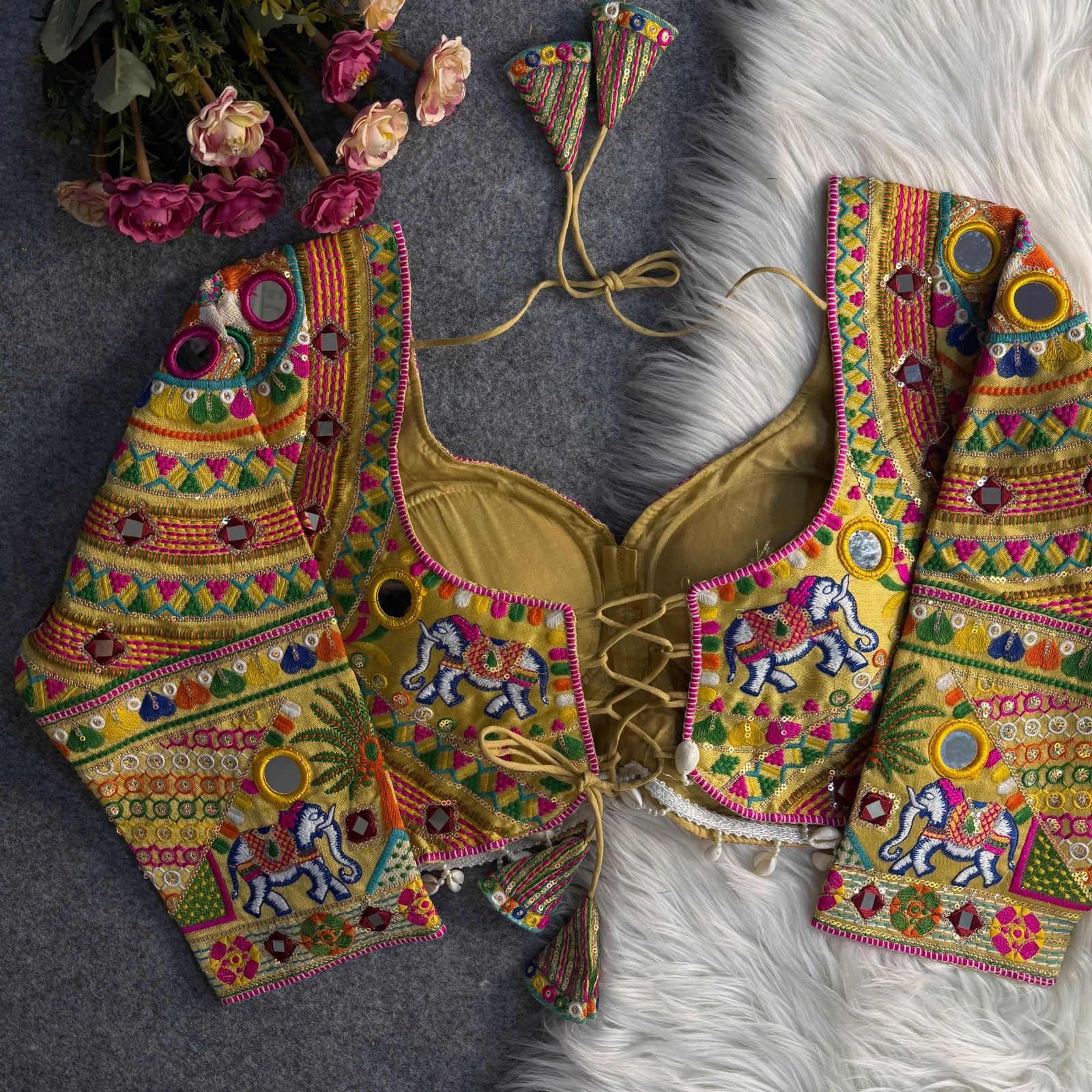 Make a dazzling statement this Navratri with our Golden multicolor full sleeves mirror work blouse. Designed for Garba nights, this blouse features heavy embroidery, hand mirror detailing, and rich sequence on premium Italian silk. Perfect for traditional flair, it adds elegance and sparkle to your Navratri outfit with its stylish back-open fit.