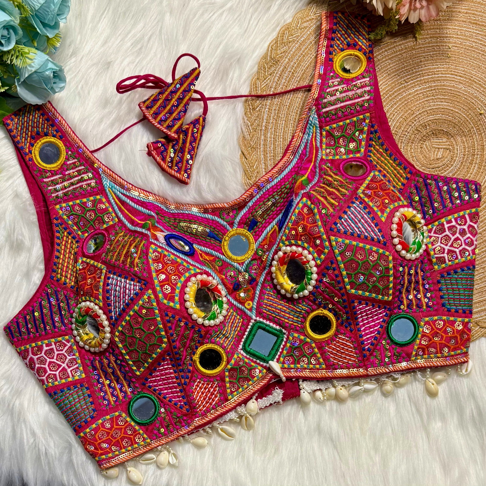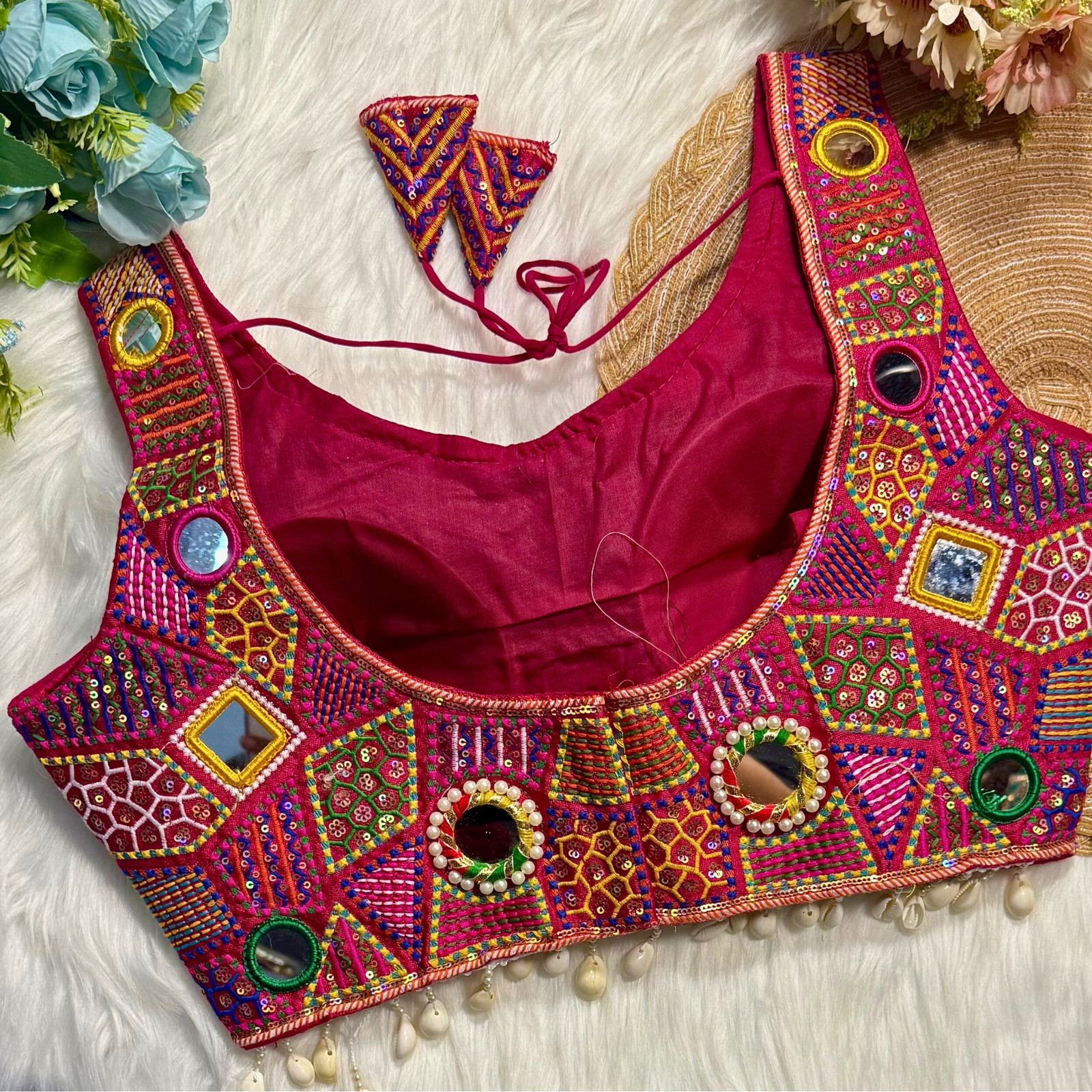 Get ready for Navratri, Garba, and Dandiya nights with this stylish readymade blouse. Made from rich Heavy Italian Silk, it features a fancy Gamthi and Shell Lace design. The blouse is padded, stitched beautifully, and perfect for festive nights. A must-have readymade blouse for your ethnic celebration look.