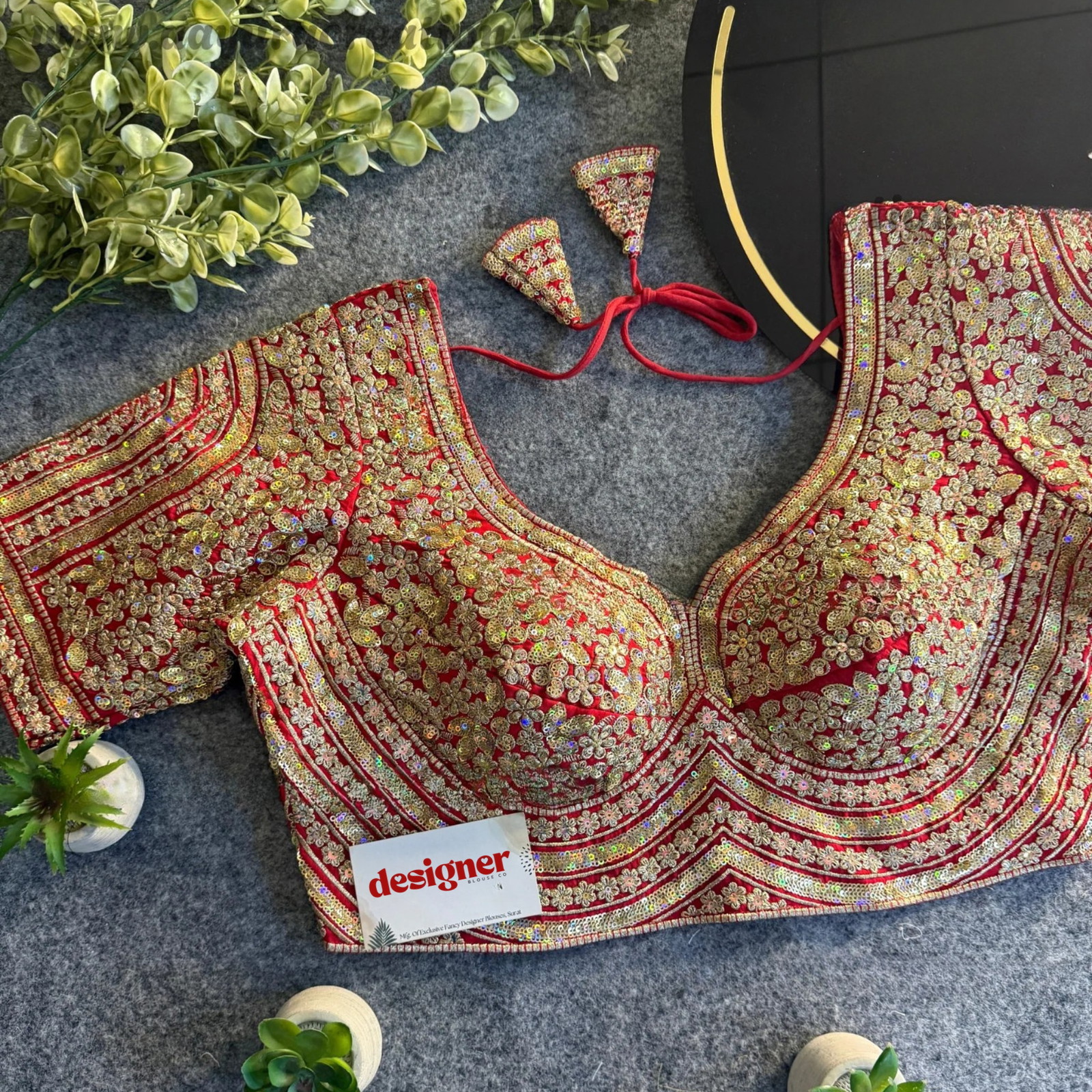 This Italian Silk Sabyasachi neck designer blouse features exquisite heavy coding and shimmering sequin handwork for a true luxury look. With pure cotton lining, built-in pads, full sleeves and back-open hooks, this blouse is perfect for grand wedding, party and festive saree or lehenga styling.