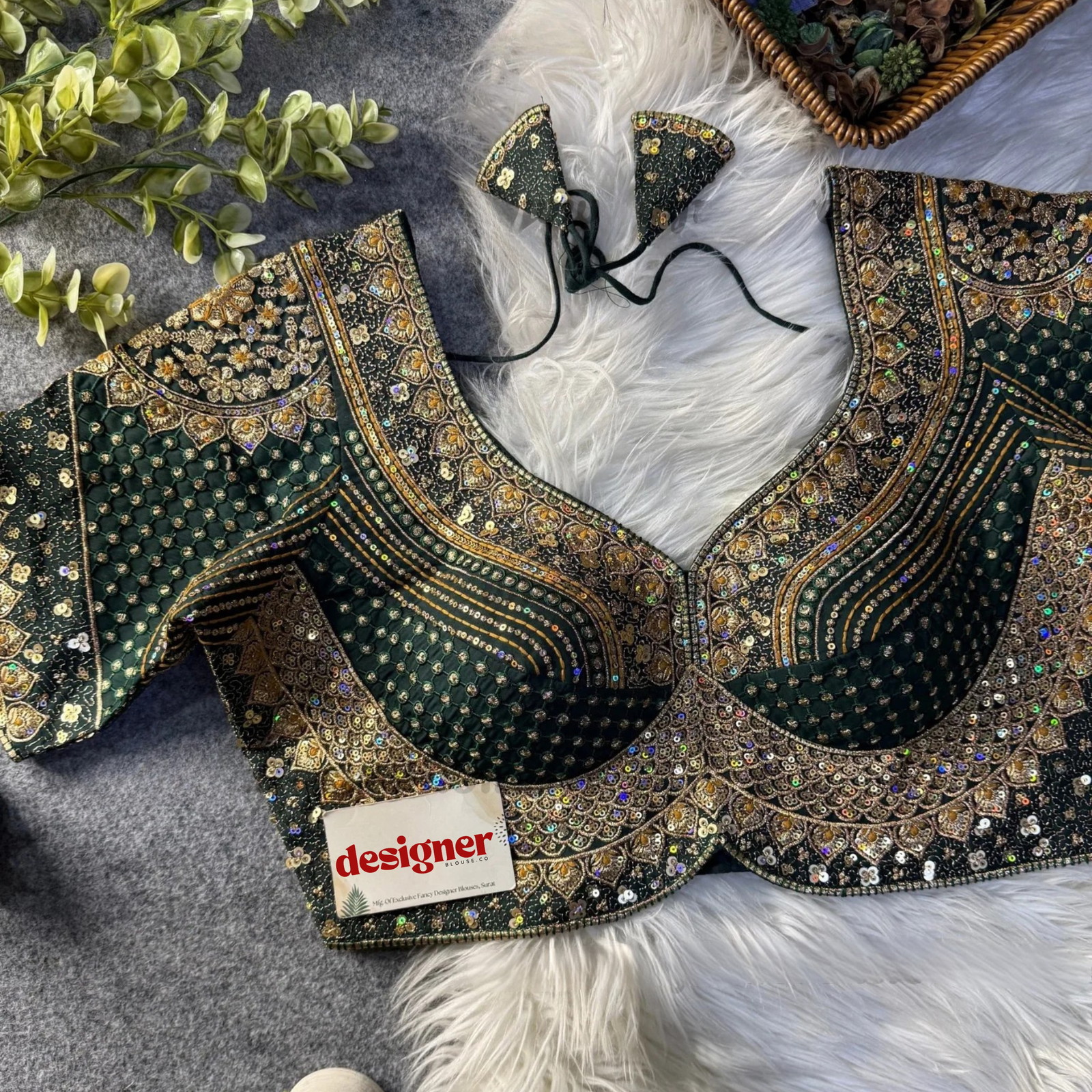 Elevate your bridal look with this Sabyasachi inspired blouse design in heavy georgette. Rich codding and shimmering sequins highlight the iconic Sabyasachi blouse design, paired with breathable cotton lining and built-in pads. this readymade blouse alterable 34–42 sizes—perfect for weddings, sangeet, and grand festive events.