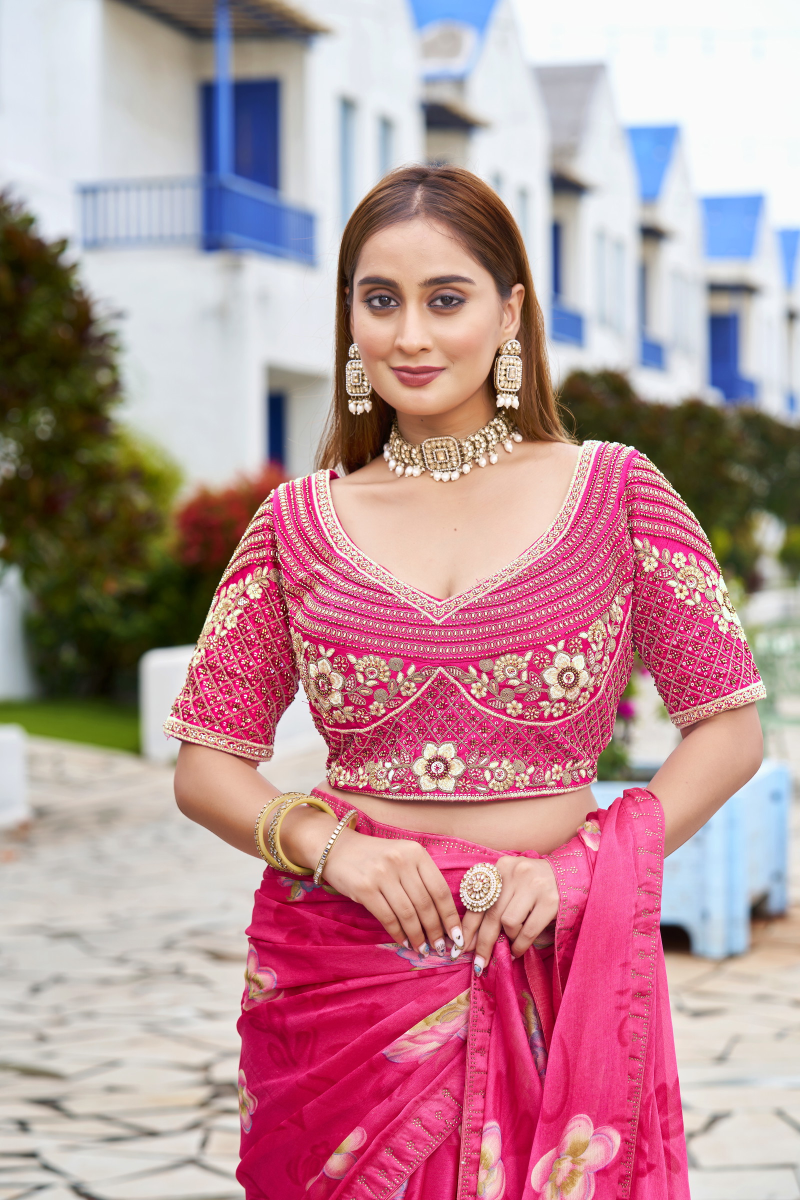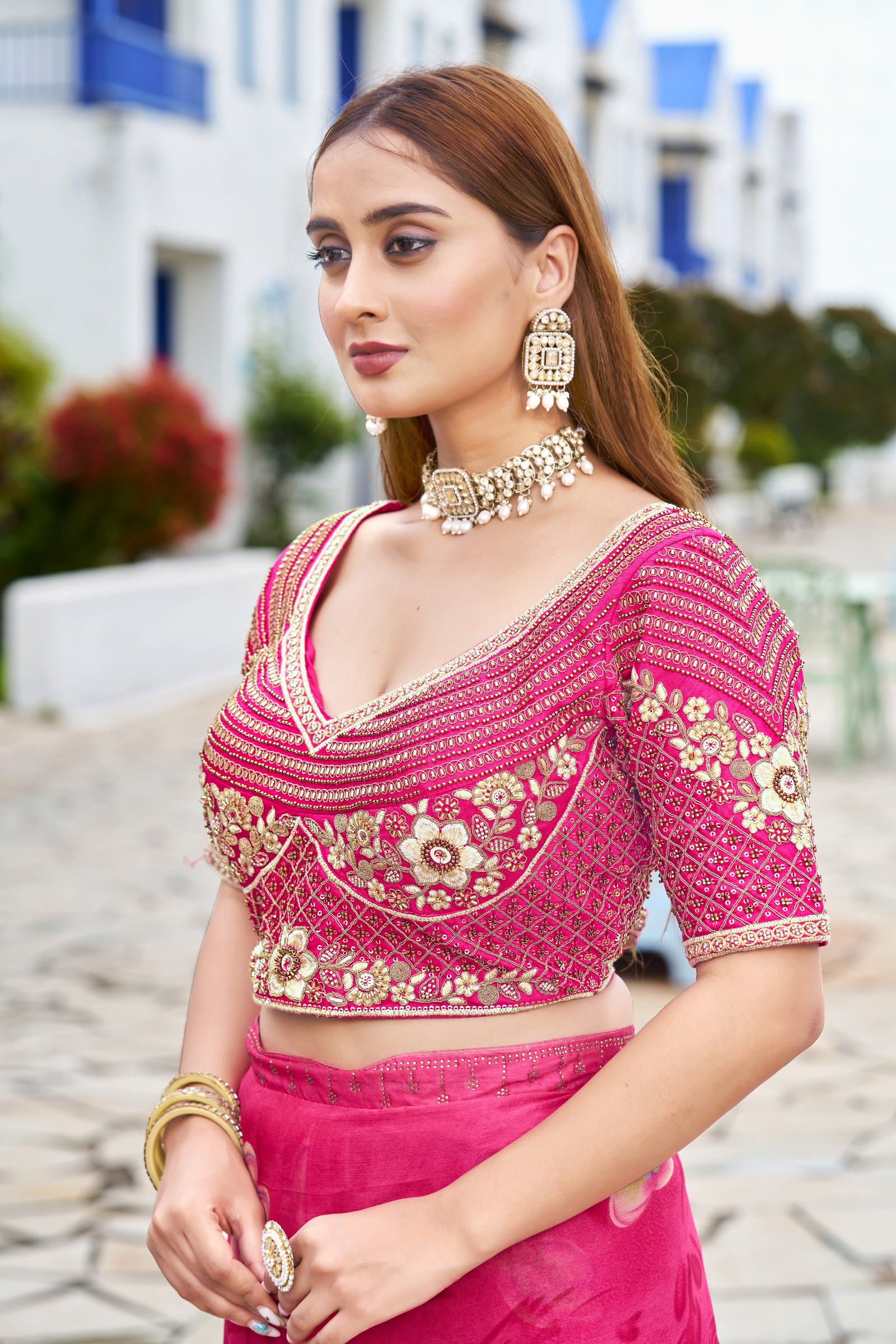 Elevate your bridal look with this Sabyasachi inspired blouse design in heavy georgette. Rich codding and shimmering sequins highlight the iconic Sabyasachi blouse design, paired with breathable cotton lining and built-in pads. this readymade blouse alterable 34–42 sizes—perfect for weddings, sangeet, and grand festive events.