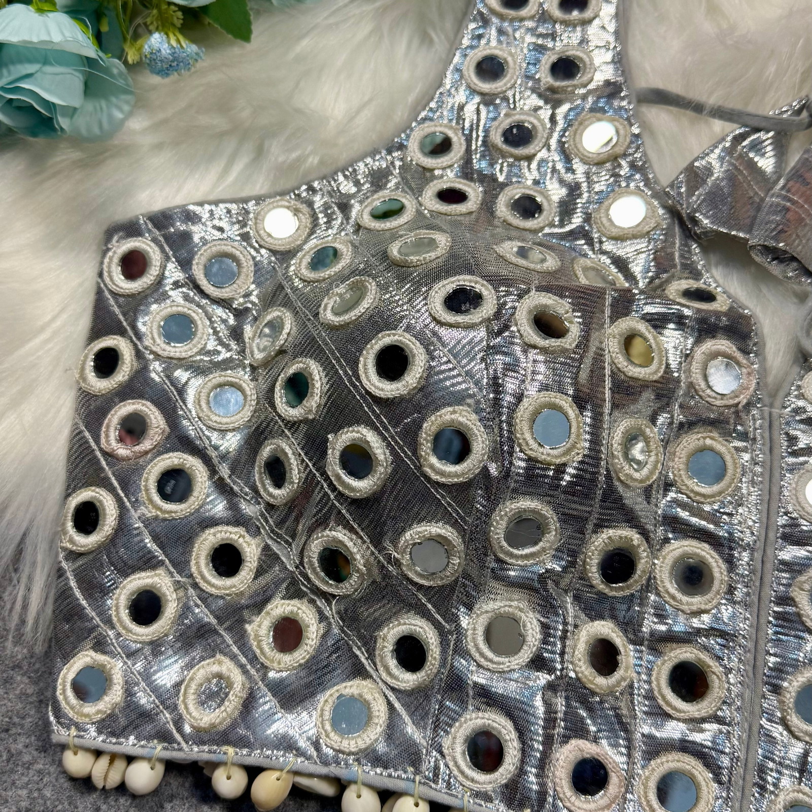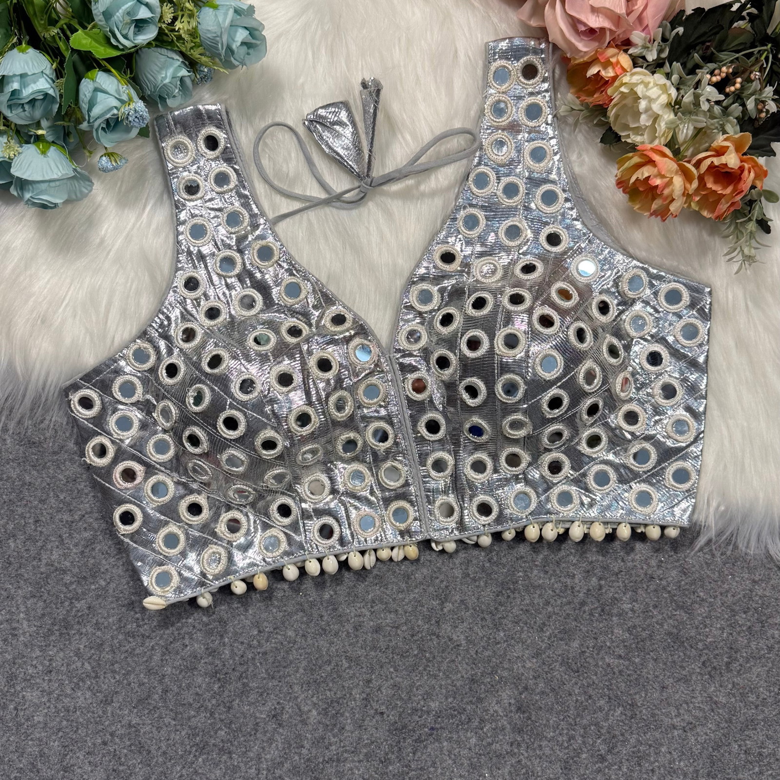 Shine bright in this Navratri readymade blouse, featuring vibrant multi-color circular mirror work and a classic dori-tie back. Crafted for festive flair, it’s adorned with shell lace for that authentic dandiya vibe. Perfect for Garba nights, this blouse pairs beautifully with lehengas, skirts, or sarees for an eye-catching traditional look.