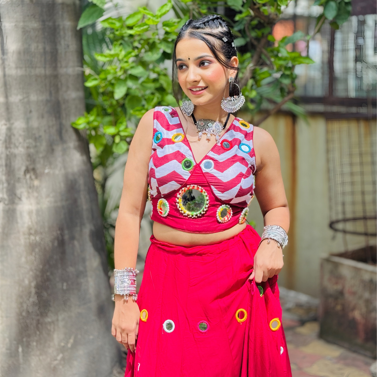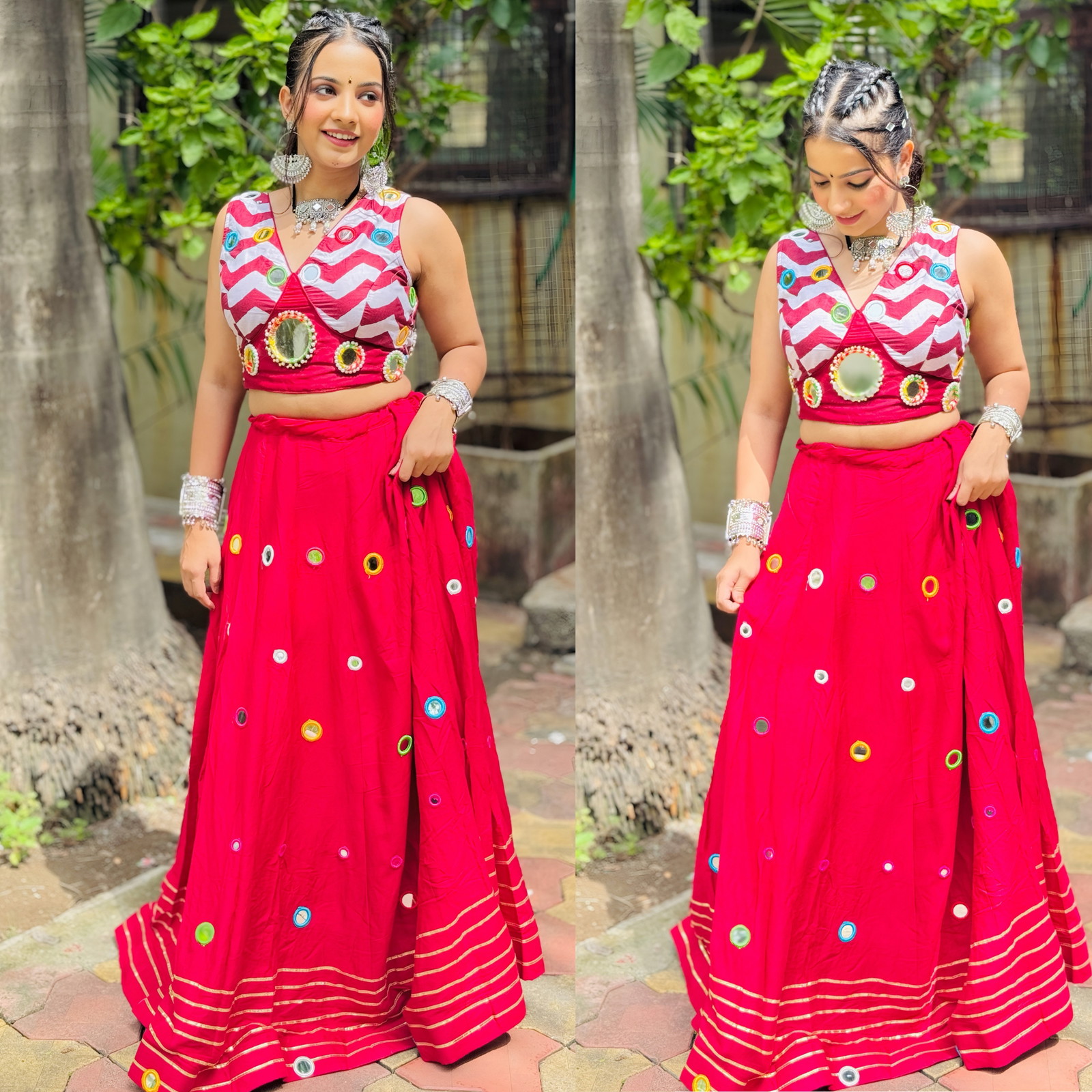 Turn heads this festive season with our Stylish Red Color Chaniya Choli with Mirror Work. Featuring intricate mirror embellishments and vibrant red hues, this set is perfect for Navratri, Garba, and special occasions. Designed for comfort and elegance, this readymade chaniya choli offers a flawless fit and a timeless festive look.