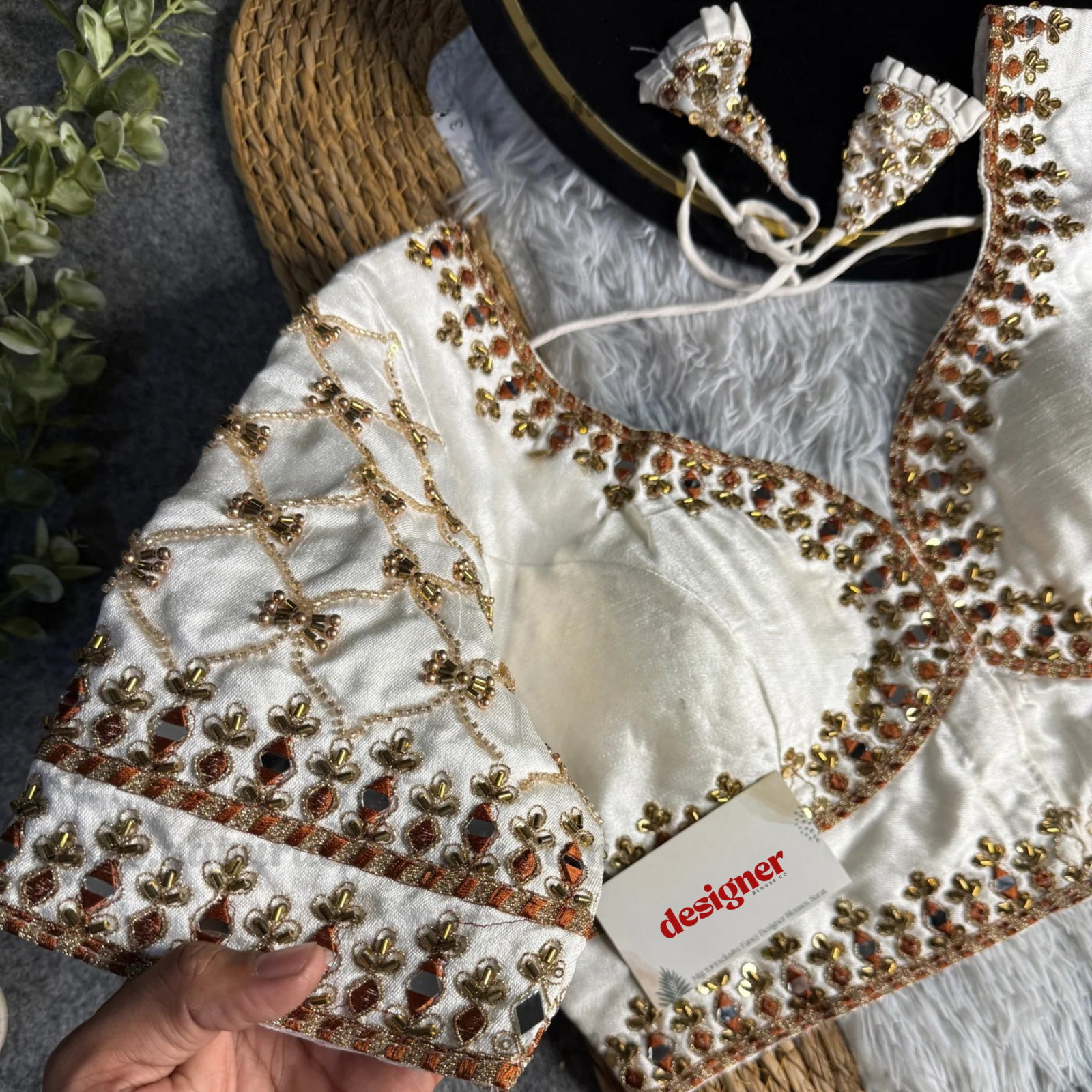 Elevate your bridal look with this Italian Silk heavy embroidery and beads work wedding blouse. Featuring a rich designer finish, padded comfort and elegant sleeves, it pairs beautifully with any saree or lehenga for weddings, receptions and grand functions, giving you a royal, timeless and luxurious appearance all day long.