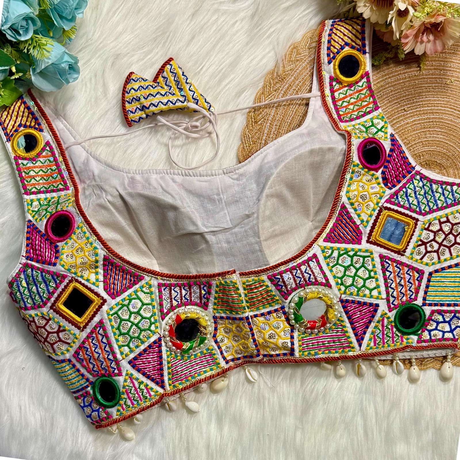 Get ready for Navratri, Garba, and Dandiya nights with this stylish readymade blouse. Made from rich Heavy Italian Silk, it features a fancy Gamthi and Shell Lace design. The blouse is padded, stitched beautifully, and perfect for festive nights. A must-have readymade blouse for your ethnic celebration look.