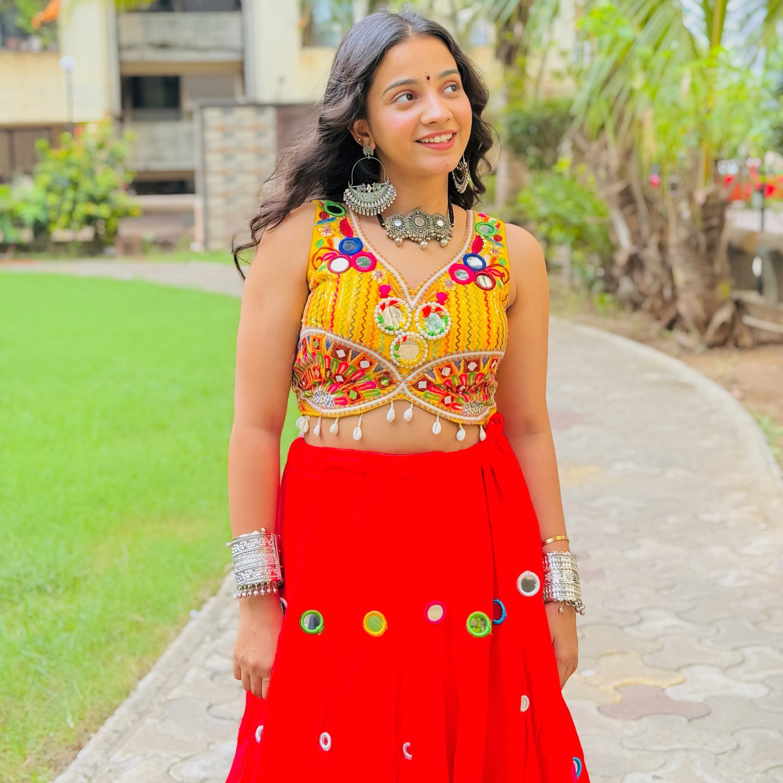 Step into the festive season with our Heavy Embroidery Mirror Work Chaniya Choli Set for Navratri. This stunning outfit features intricate embroidery and mirror embellishments, adding a touch of elegance and tradition. Perfect for Garba nights and festive celebrations, this readymade chaniya choli offers both style and comfort for your special occasions.