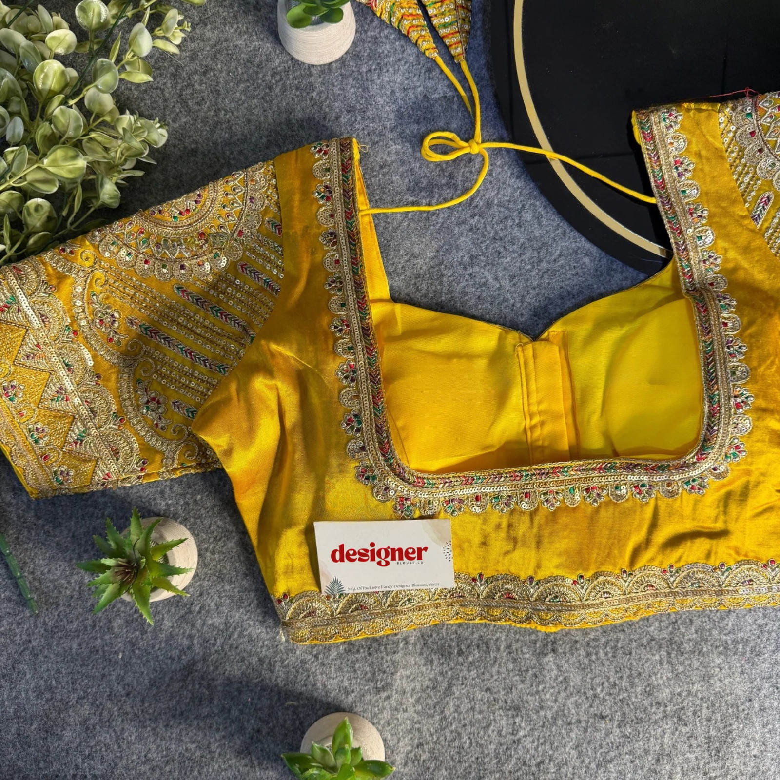 Beautiful Embroidery Work Designer Blouse in rich Gajji Silk, styled for a premium festive and traditional look. This padded front-open blouse with hooks, 15-inch length and 10+ inch sleeves fits 34–42 bust comfortably, adding timeless elegance and sophistication to any saree or lehenga for weddings and special occasions.
