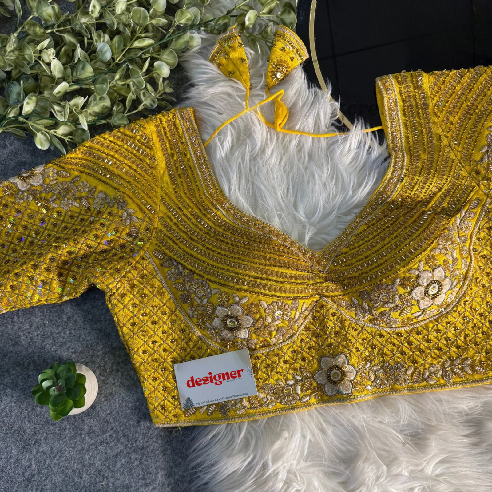 Elevate your bridal look with this Sabyasachi inspired blouse design in heavy georgette. Rich codding and shimmering sequins highlight the iconic Sabyasachi blouse design, paired with breathable cotton lining and built-in pads. this readymade blouse alterable 34–42 sizes—perfect for weddings, sangeet, and grand festive events.